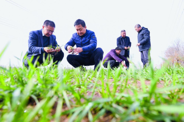 图为石家庄市农林科学研究院专家与晋州市农技人员一起查看晚播小麦生长情况。记者张晓峰摄
